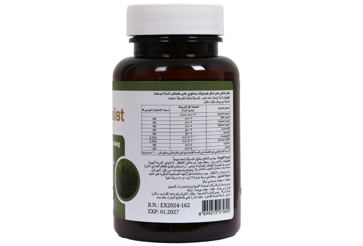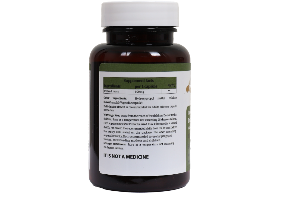 - Ingredients per 1 capsule: Iceland moss 600 mg,Hydroxypropyl methyl cellulose (E464) (Vegetable capsule) 110 mg